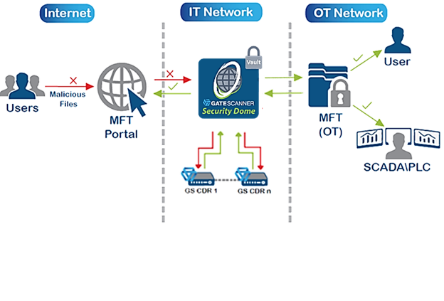 - The decontaminated files are shared from the Dome to the OT users, through network folders, mail or removable media.